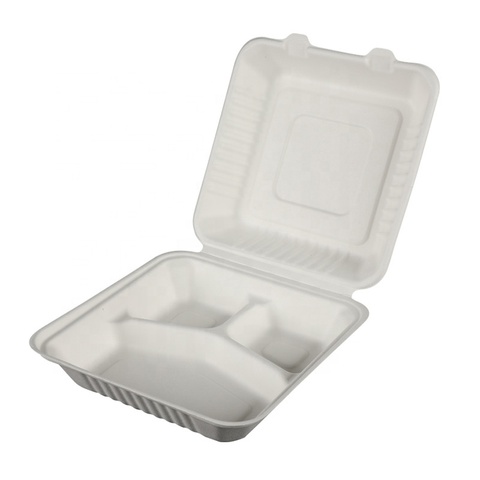 9*6 इंच सफेद क्लैमशेल पैकेजिंग कंटेनर गन्ने के बैग से रेस्तरां के लिए भोजन का लंच बॉक्स